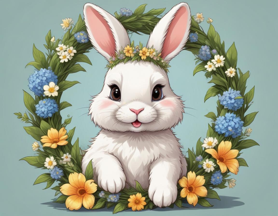A cheerful white rabbit surrounded by colorful flowers, wearing a floral crown, perfect for a spring or Easter theme.
