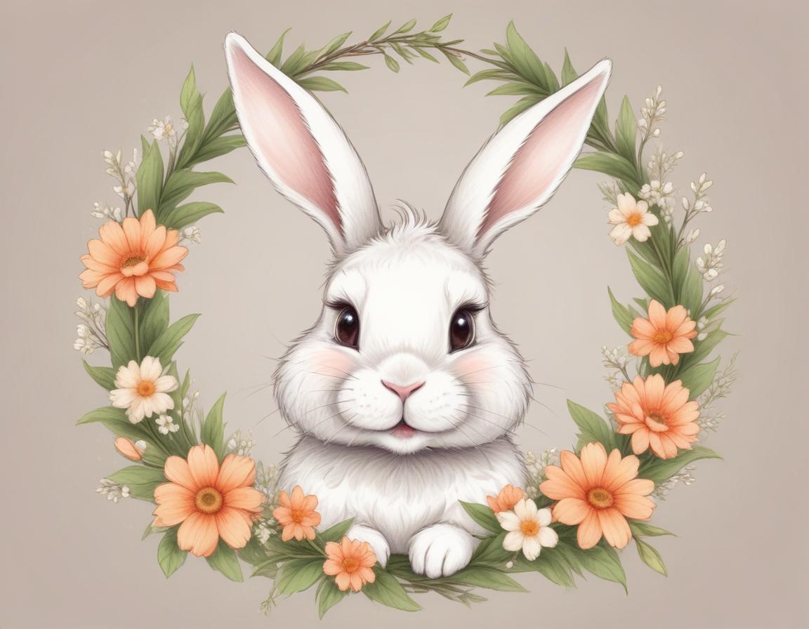 A fluffy white rabbit peeks out from a floral wreath filled with orange and green details, creating a cheerful and whimsical atmosphere.