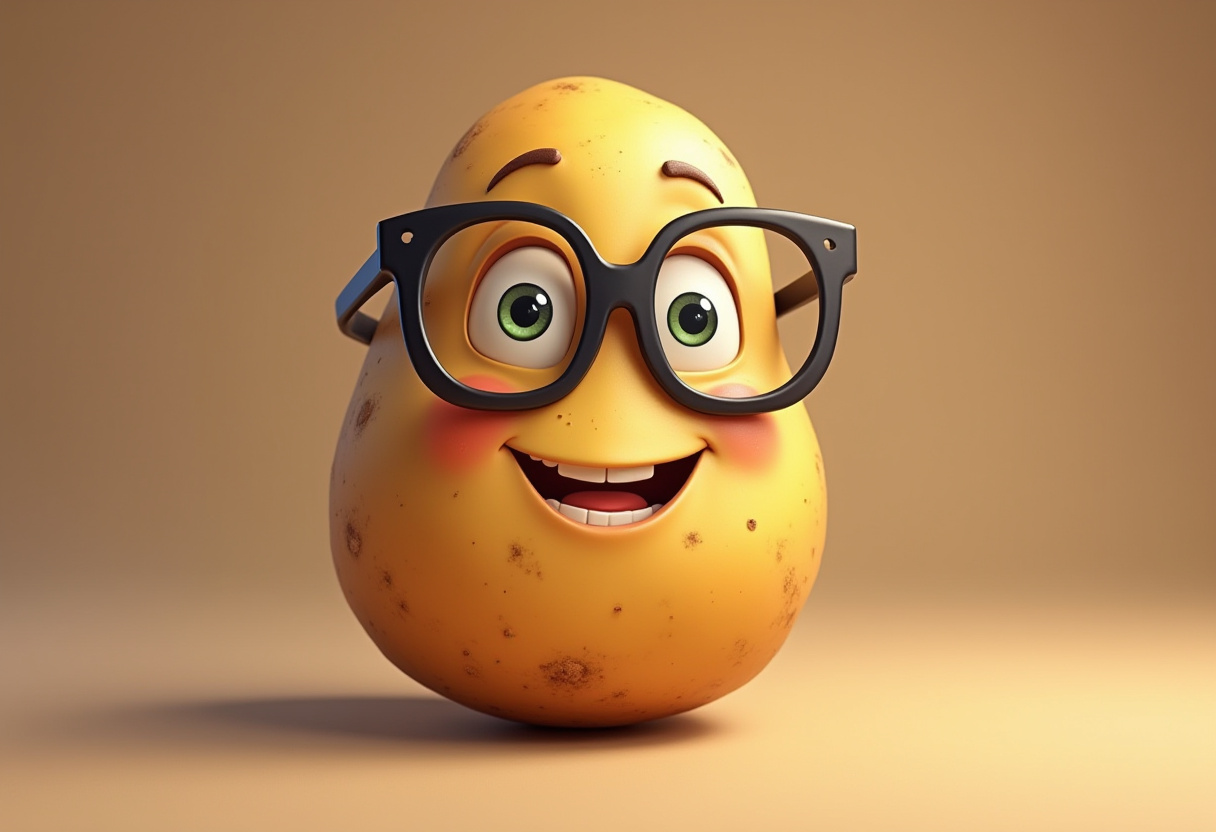 animated, cartoon, character, content, cute, design, expression, friendly, fun, glasses, humor, illustration, joyful, light-hearted, personality, playful, potato, smile, vegetable, whimsical