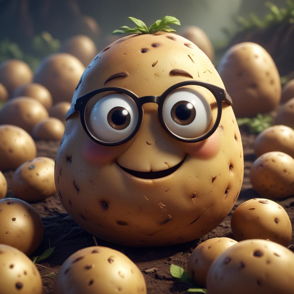 A cheerful cartoon potato with glasses smiles amid numerous potatoes in a lush, green environment.