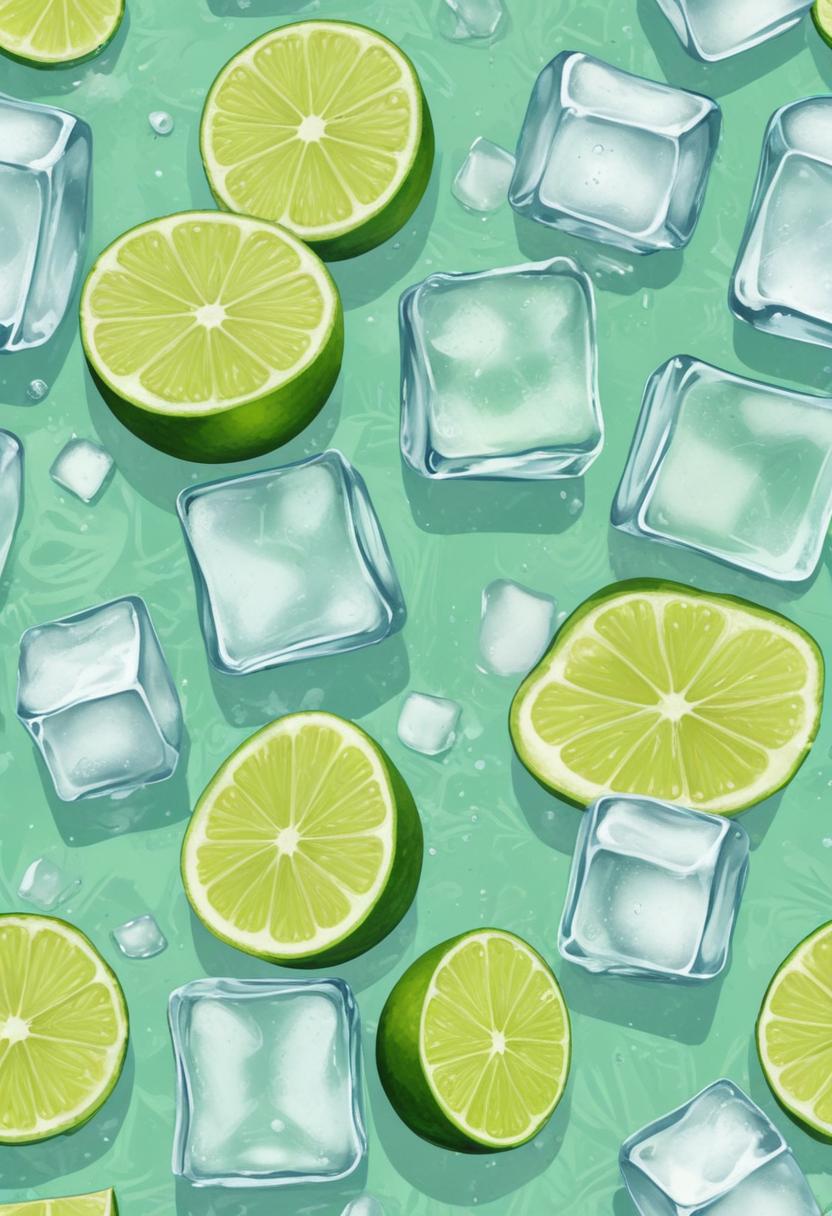 Slices of lime and ice cubes are scattered across a turquoise surface, creating a vibrant and refreshing composition perfect for summer.