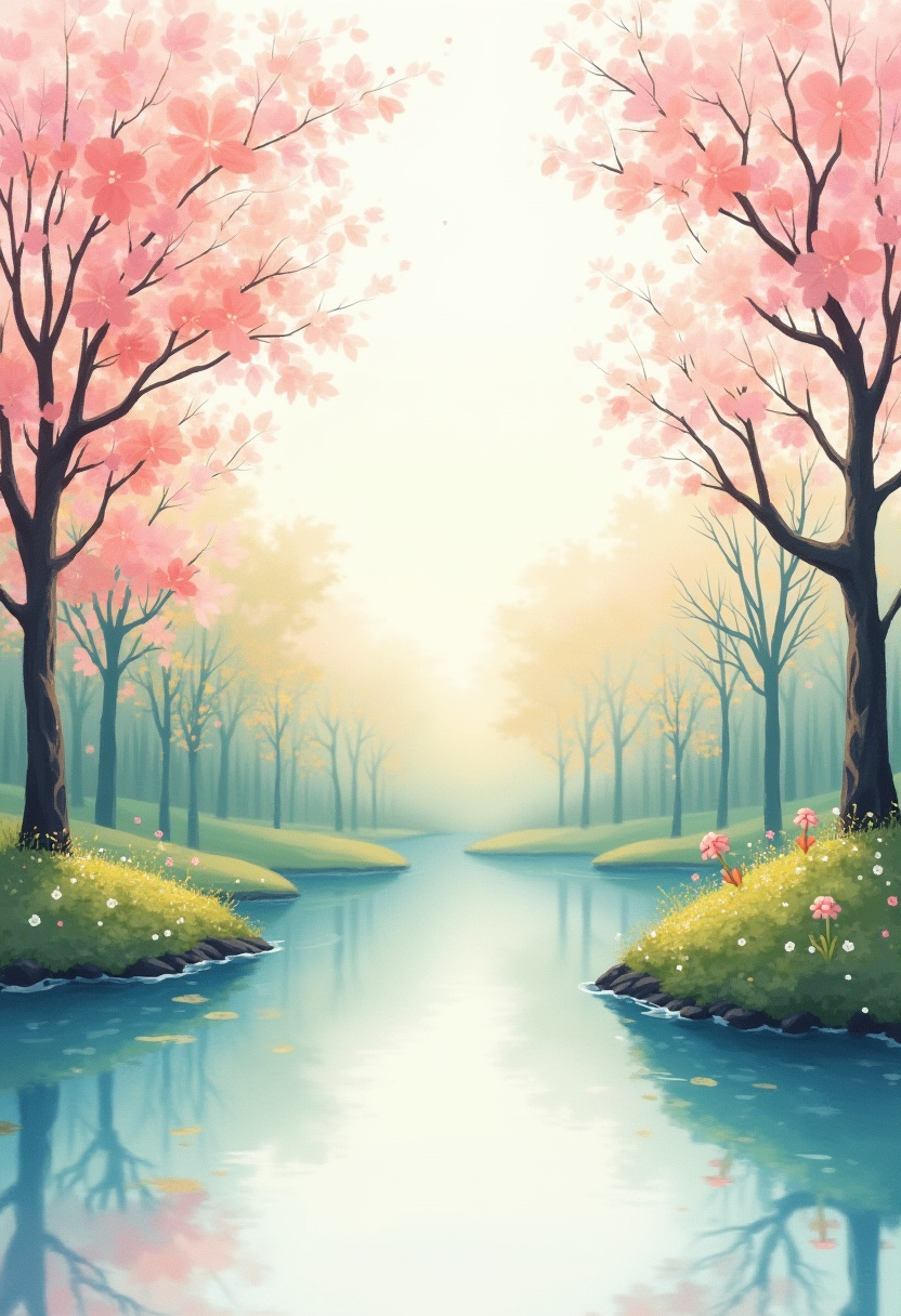 A tranquil river flows through a landscape adorned with blooming cherry trees, creating a peaceful atmosphere and soft reflections.