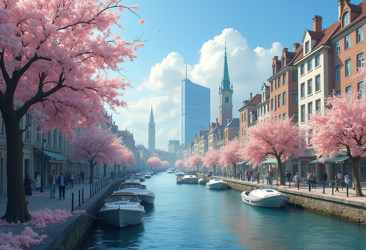 Soft pink cherry blossoms frame the peaceful canal lined with boats, creating a picturesque springtime atmosphere in a vibrant city.