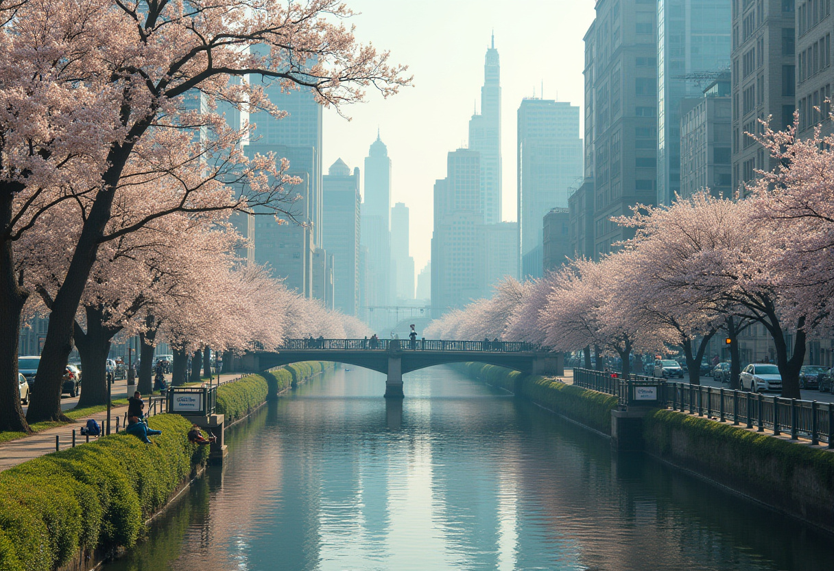 Cherry blossoms bloom by river in vibrant cityscape