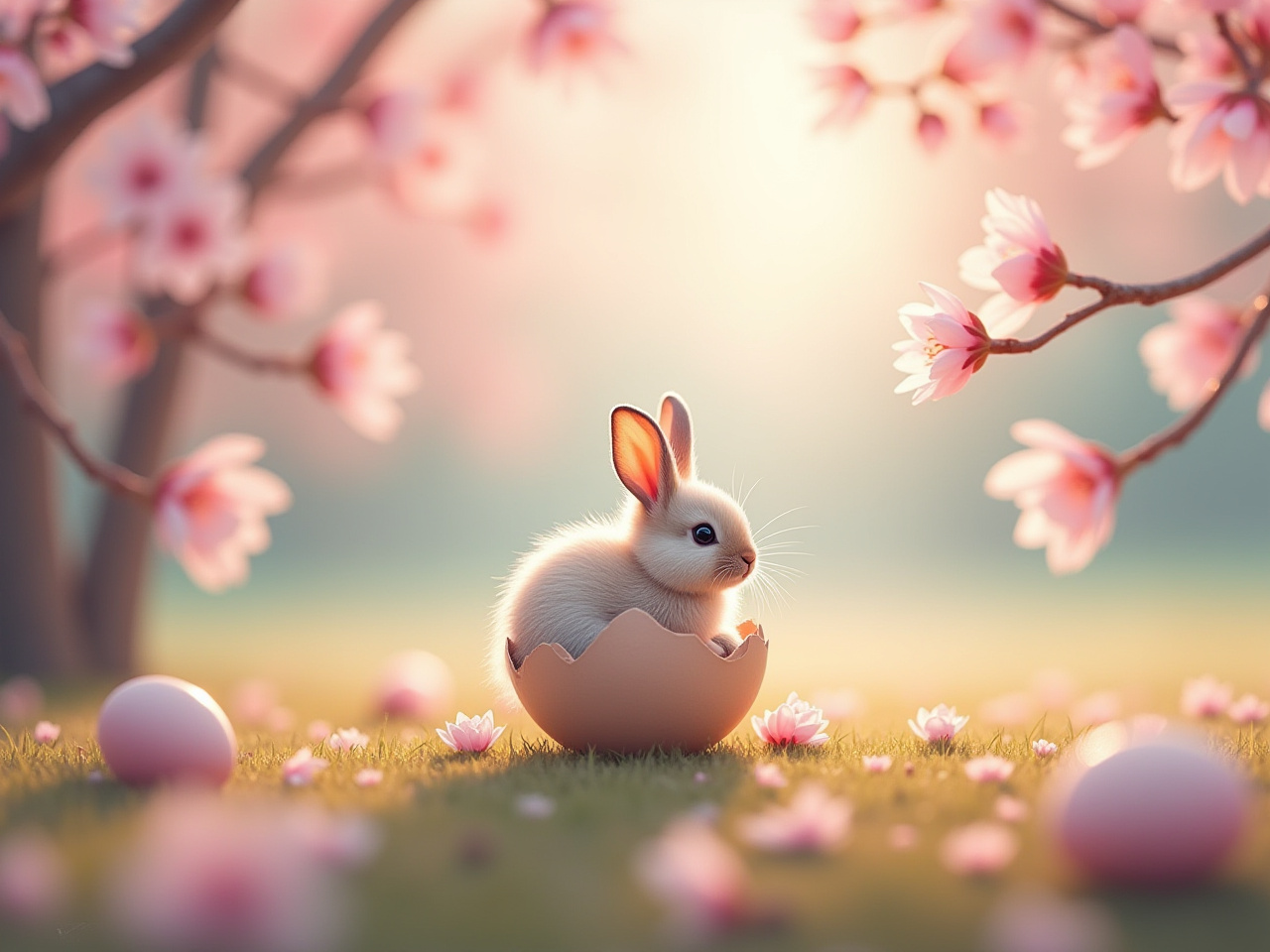 A small bunny sits in a cracked eggshell surrounded by soft pink cherry blossoms and pastel-colored eggs on a serene spring morning.