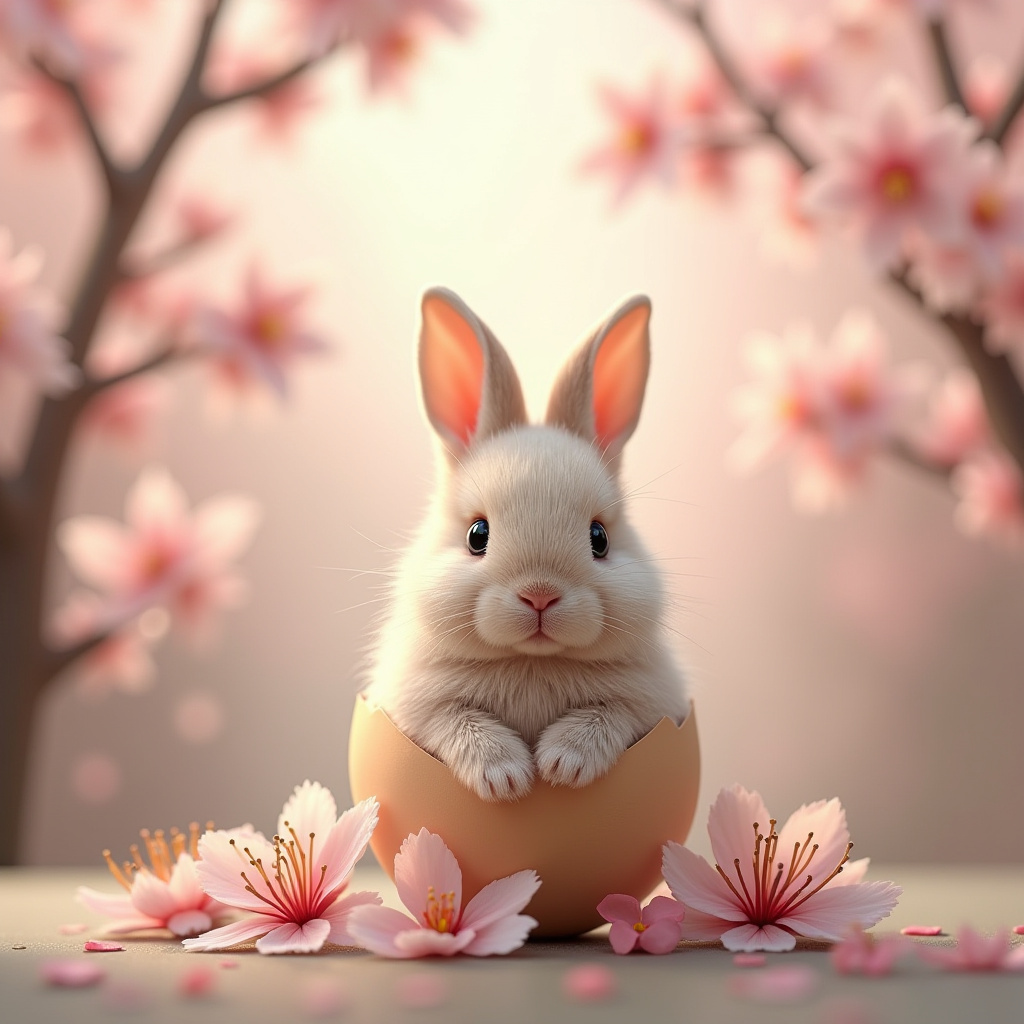 A fluffy bunny is nestled in an eggshell surrounded by cherry blossoms, showcasing the beauty of spring and renewal in a serene setting.
