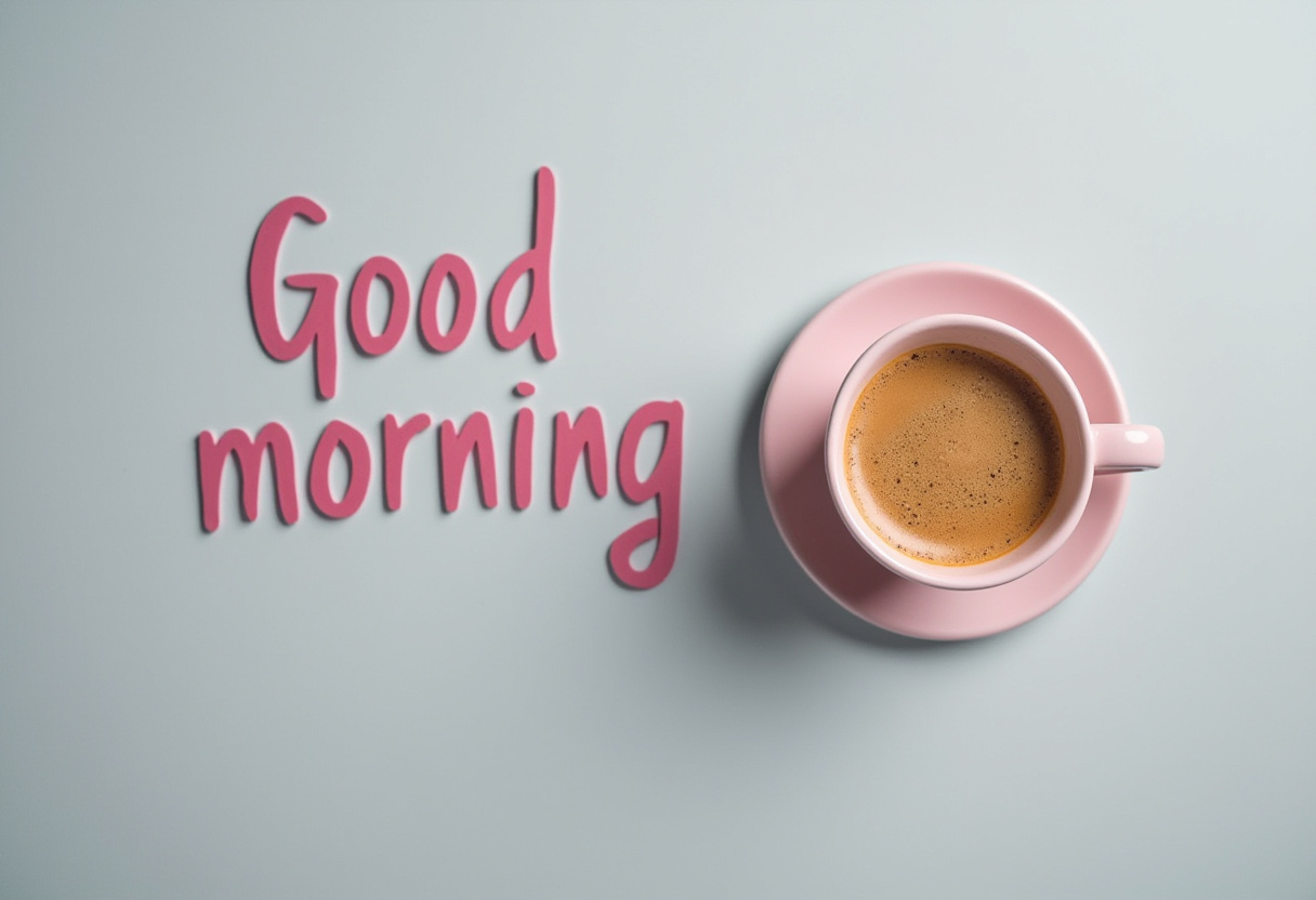 A pink cup filled with coffee sits beside the words Good morning on a soothing pastel background, creating a warm and inviting atmosphere.