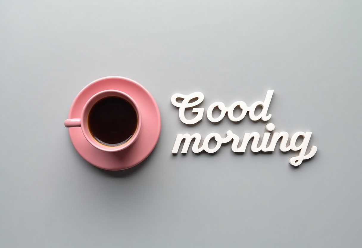 A pink cup filled with coffee is accompanied by the words 'Good morning' on a neutral background, radiating a cozy start to the day.