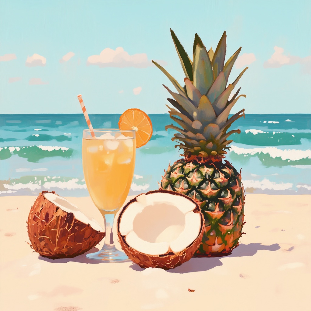 A refreshing drink sits by a pineapple and coconuts on a sunny beach. Waves gently roll in under a clear blue sky, creating a serene atmosphere.