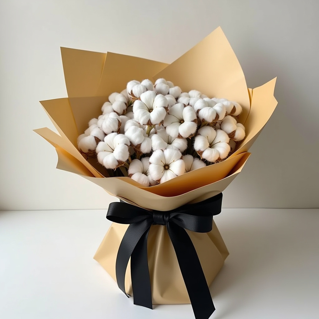 A beautiful bouquet made of cotton flowers arranged in stylish packaging with a black ribbon, perfect for gifting on special occasions.