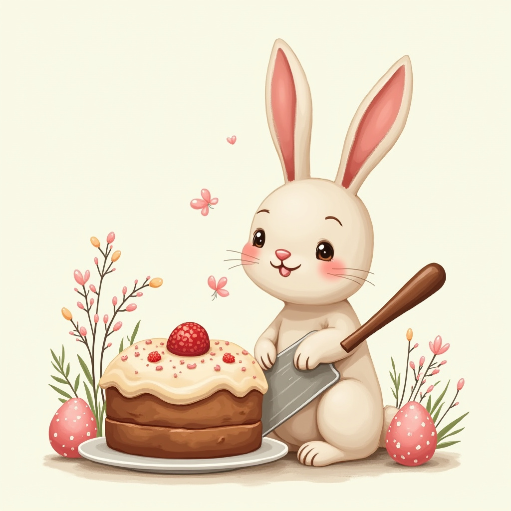 A cheerful bunny with long ears cuts a cake adorned with strawberries and surrounded by colorful flowers and Easter eggs in a lively garden.