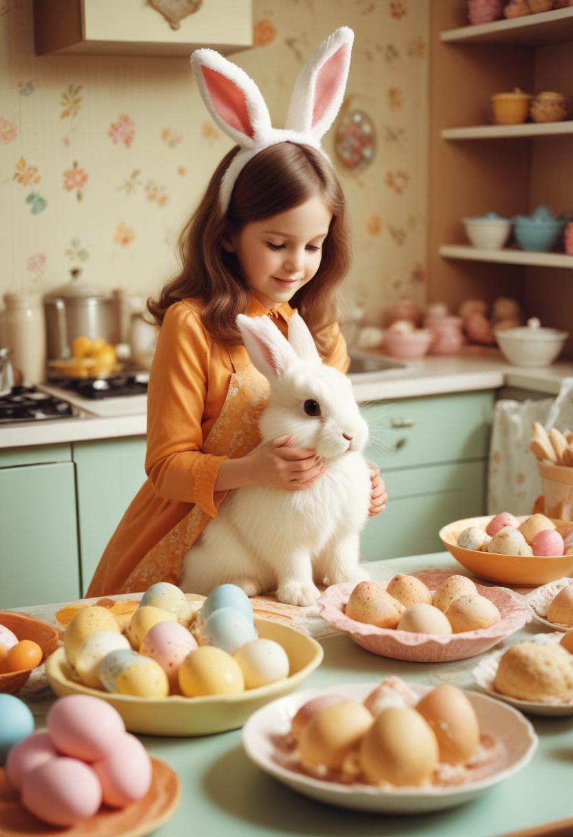 A young girl in a bright apron smiles as she holds a white rabbit surrounded by colorful Easter eggs in a cozy kitchen.