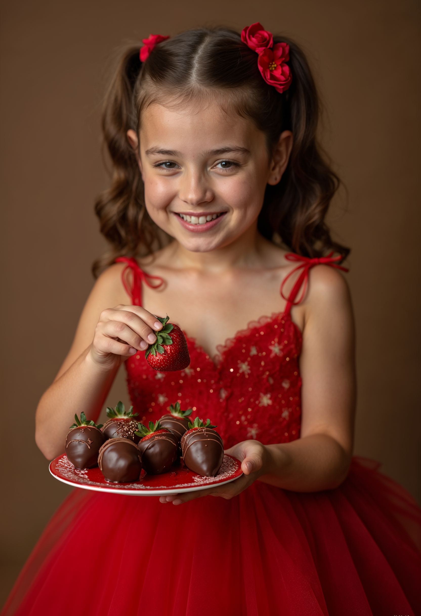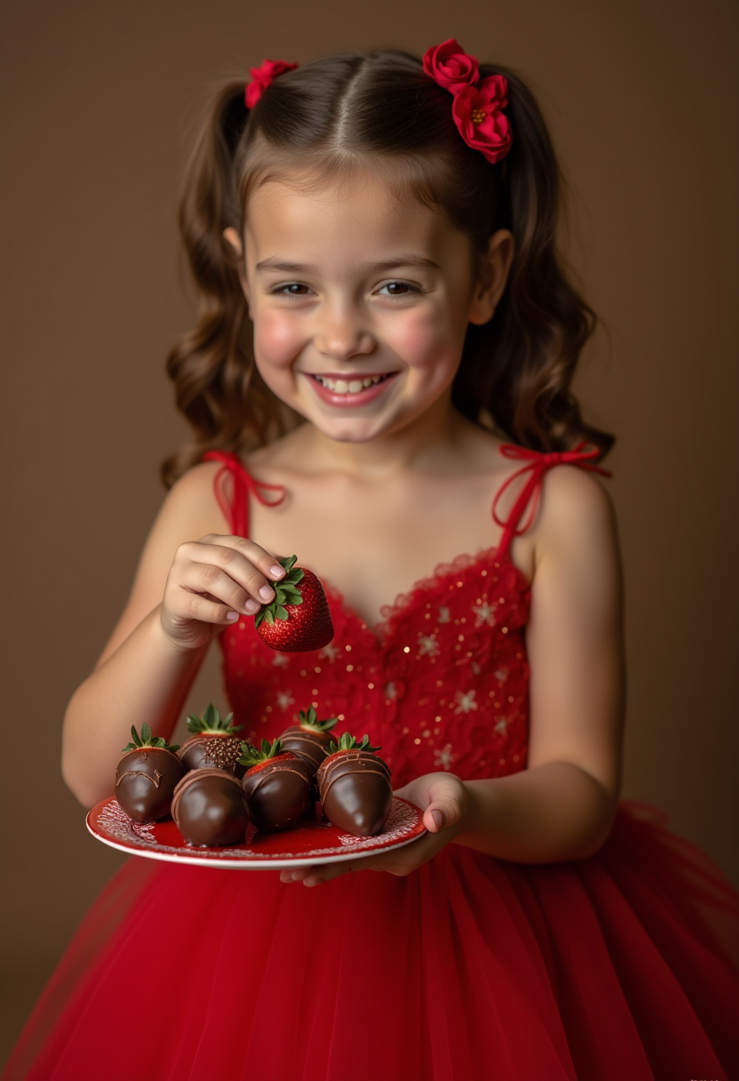 A girl in a red dress smiles while holding a plate of chocolate-dipped strawberries, showcasing her joy and festive spirit.