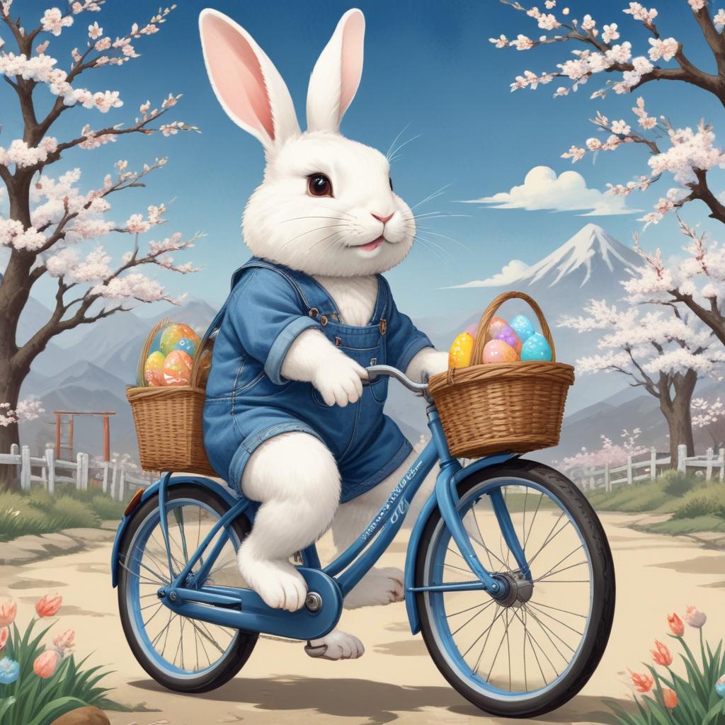 A rabbit in blue overalls rides a bicycle down a path, carrying baskets filled with colorful Easter eggs, surrounded by cherry blossoms.