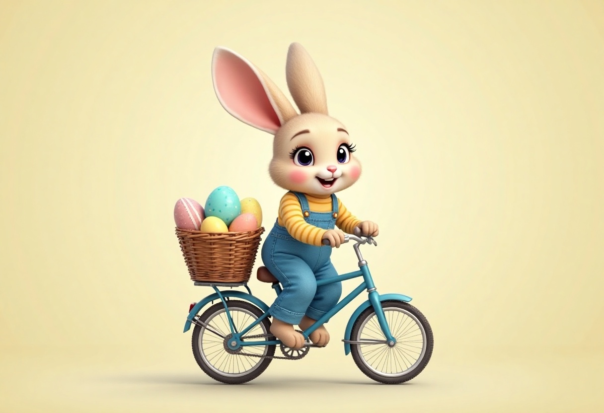 A cute bunny with big ears rides a blue bicycle, happily carrying a basket filled with colorful Easter eggs. The background is light and simple.