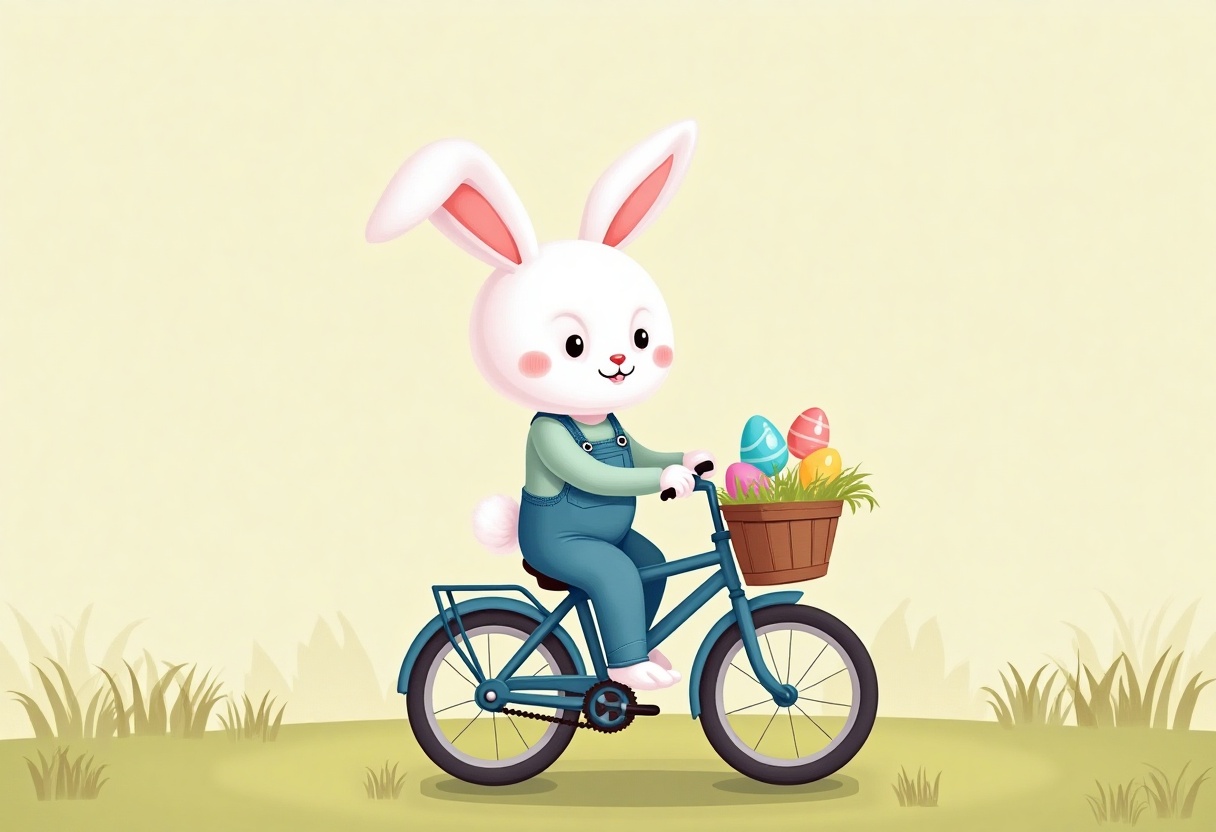 A cheerful bunny in overalls rides a bicycle, happily carrying a basket filled with colorful Easter eggs through a grassy field.