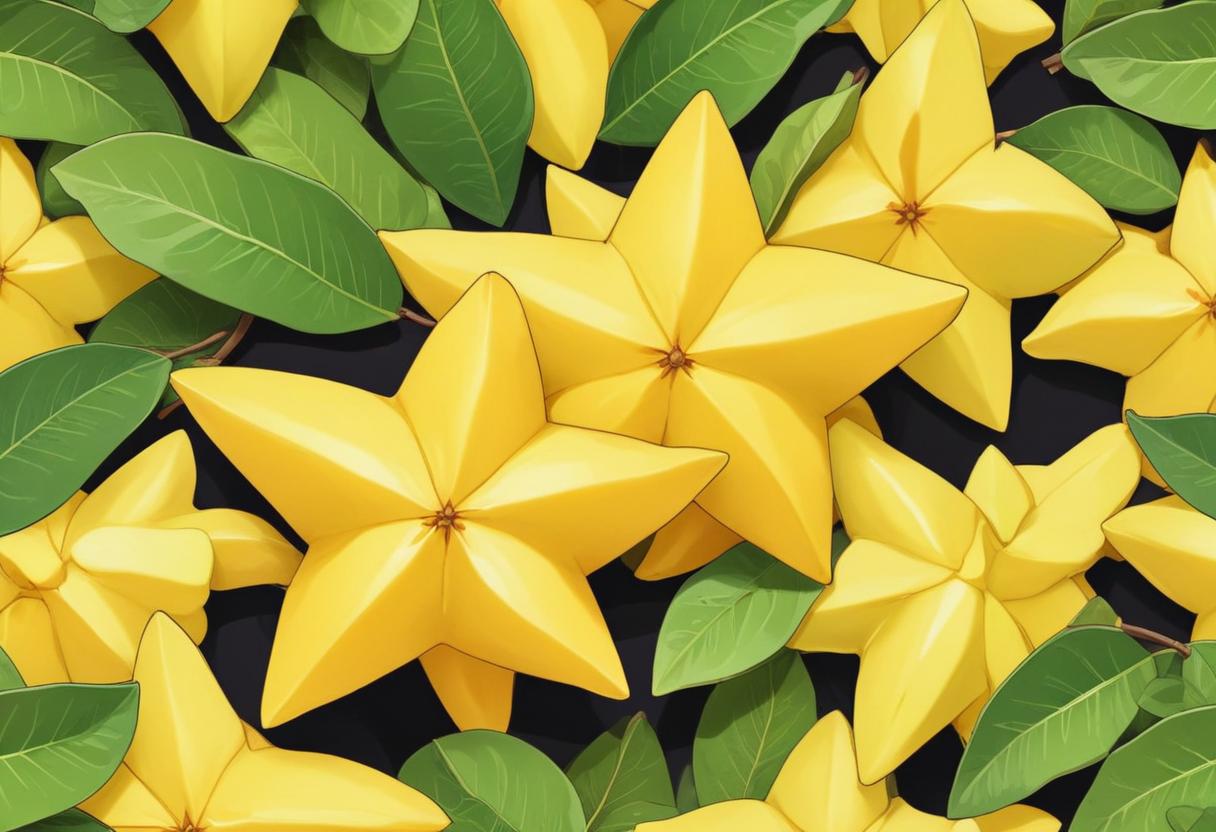Vibrant yellow star fruits lie nestled among rich green leaves, showcasing nature's colorful bounty in this detailed composition.
