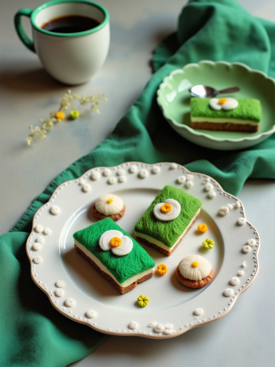 Delicate green desserts with floral decorations sit on a white plate beside a coffee cup, creating an inviting afternoon setting.