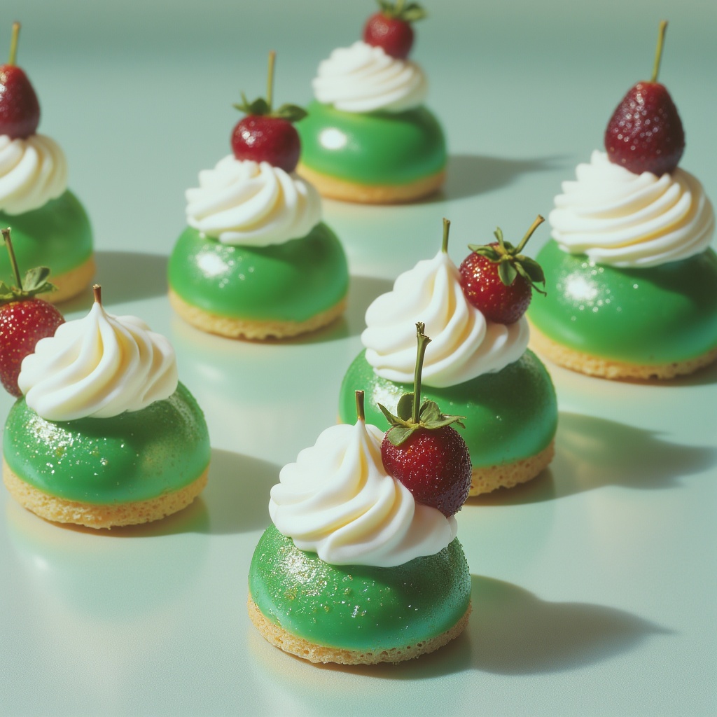 Delicious green desserts topped with whipped cream and fresh strawberries are arranged beautifully on a light surface, creating an appealing treat.