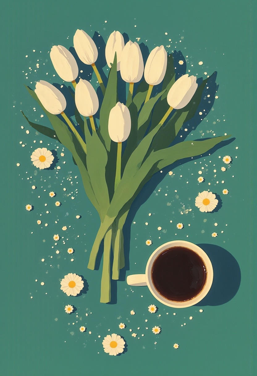 A bouquet of white tulips lies next to a cup of black coffee on a blue surface, creating a soothing and refreshing atmosphere.