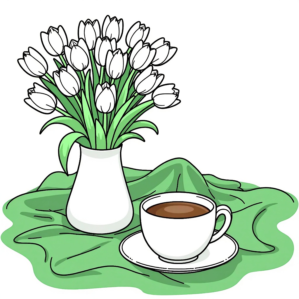 Relaxing morning with tulips and coffee on green cloth