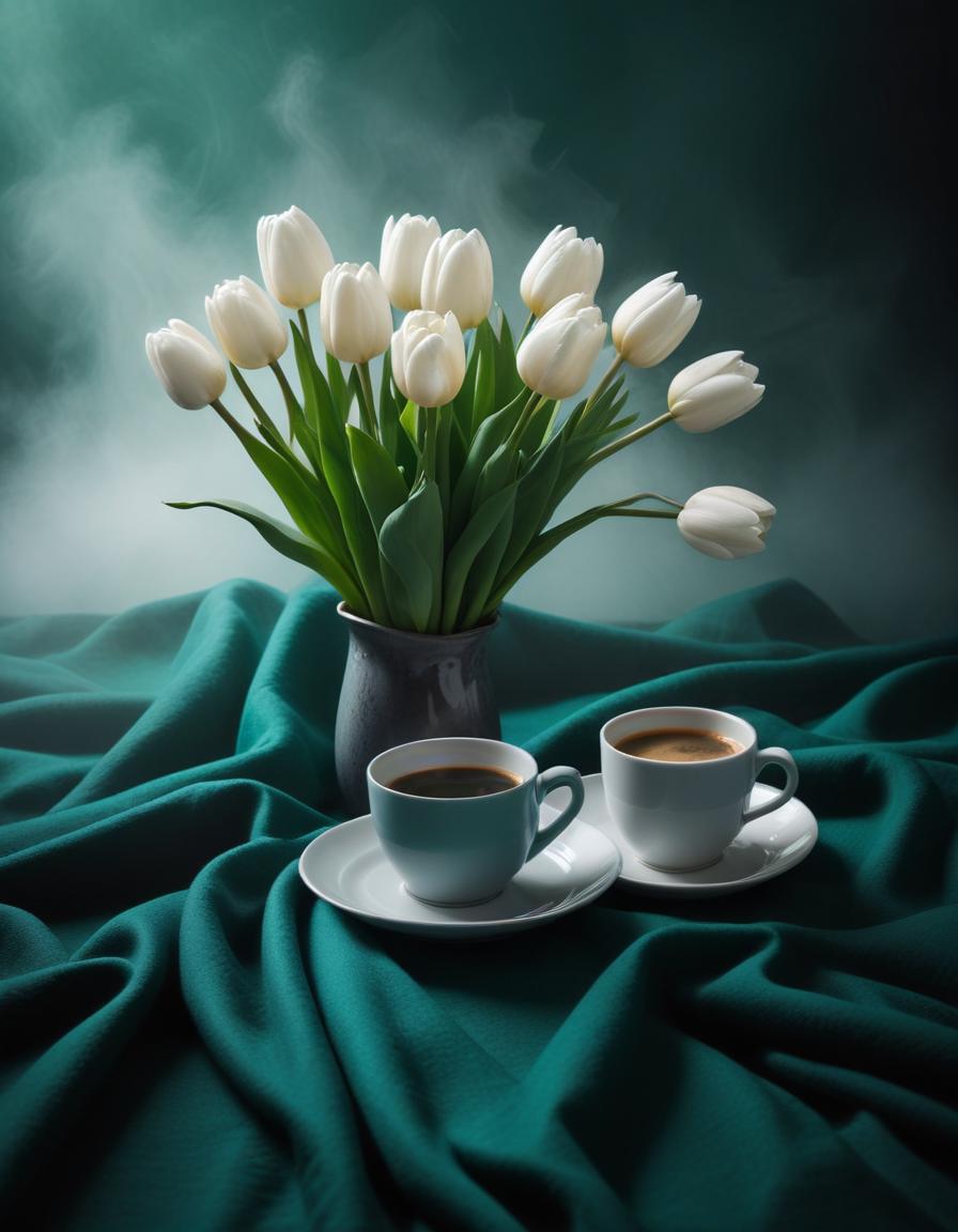 Two cups of coffee sit beside a vase of white tulips on a teal fabric. A soft, misty atmosphere enhances the tranquil setting.
