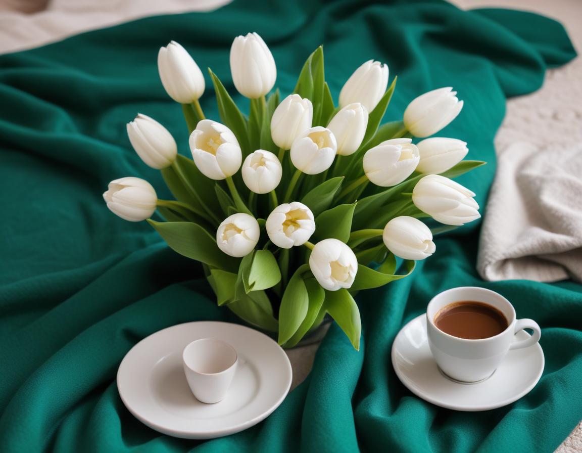 A bouquet of white tulips sits beside cups of coffee on a green blanket, creating a cozy and inviting atmosphere indoors.
