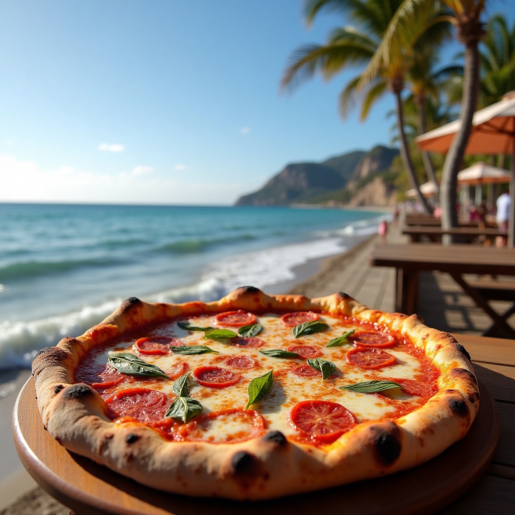 Delicious pizza served by the beach under sunny skies