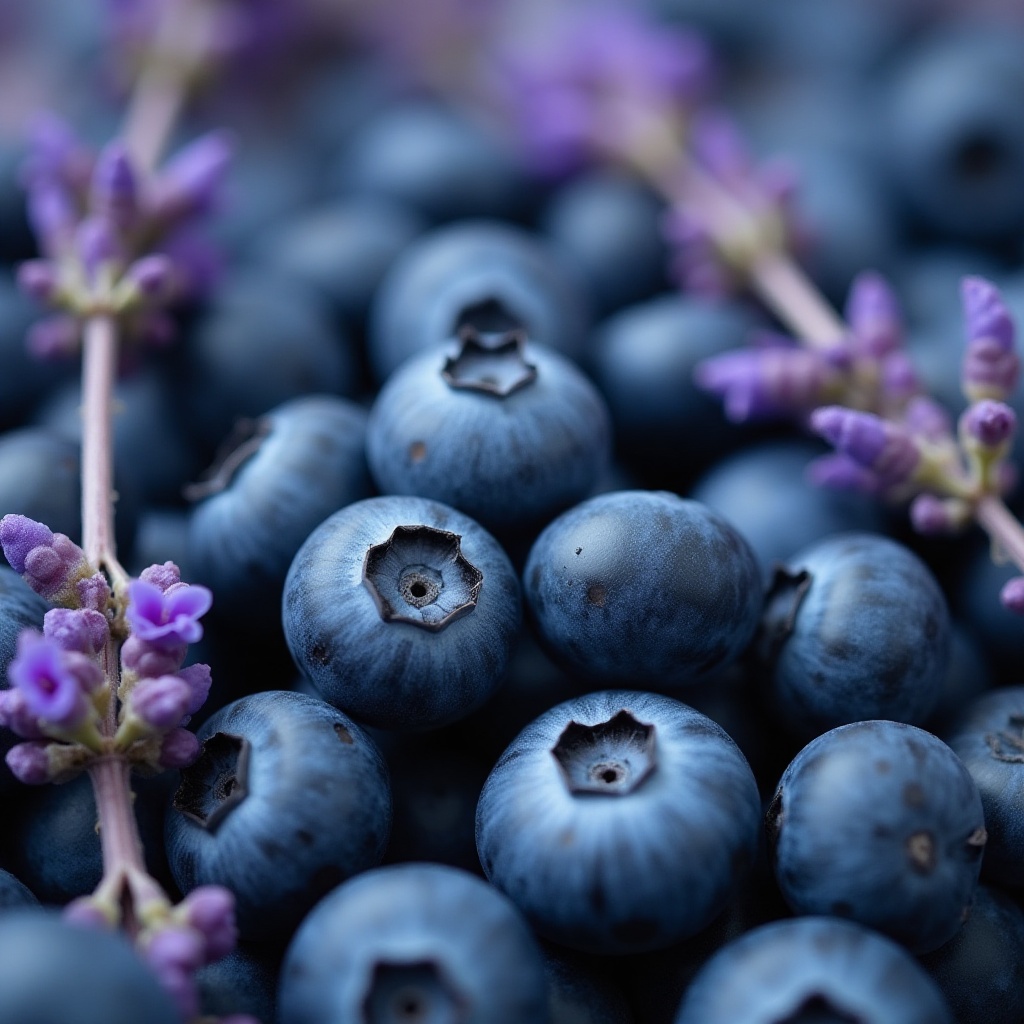 Bright blueberries lie among lavender sprigs, showcasing their rich colors during a summer harvest in a natural setting.