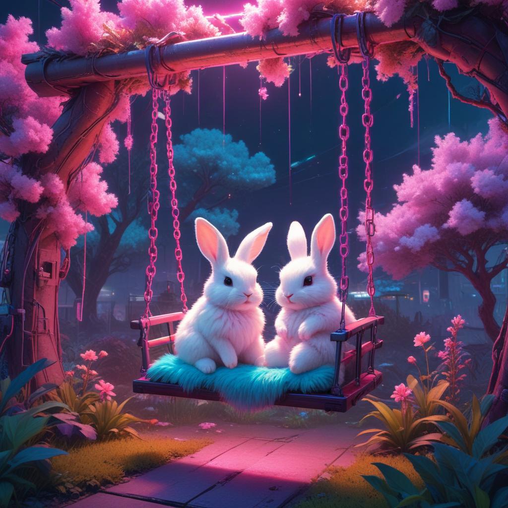 Two fluffy rabbits relax on a cozy swing surrounded by blooming cherry blossom trees under a twilight sky, creating a serene atmosphere.