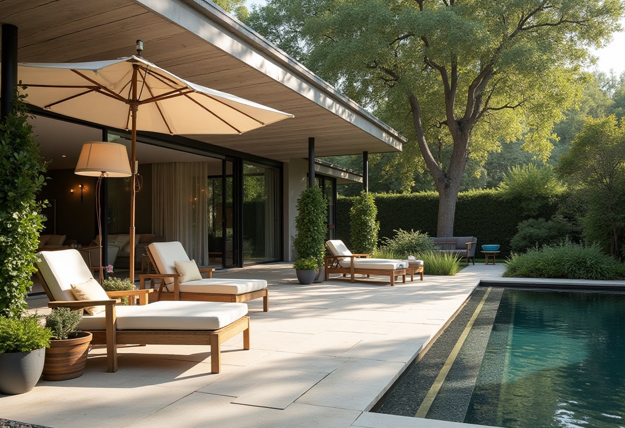 architecture, backyard, contemporary, garden, greenery, landscaping, leisure, loungers, luxury, modern design, outdoor decor, poolside, relaxation, retreat, serene, shade, sunbathing, sunny, swimming pool, umbrella