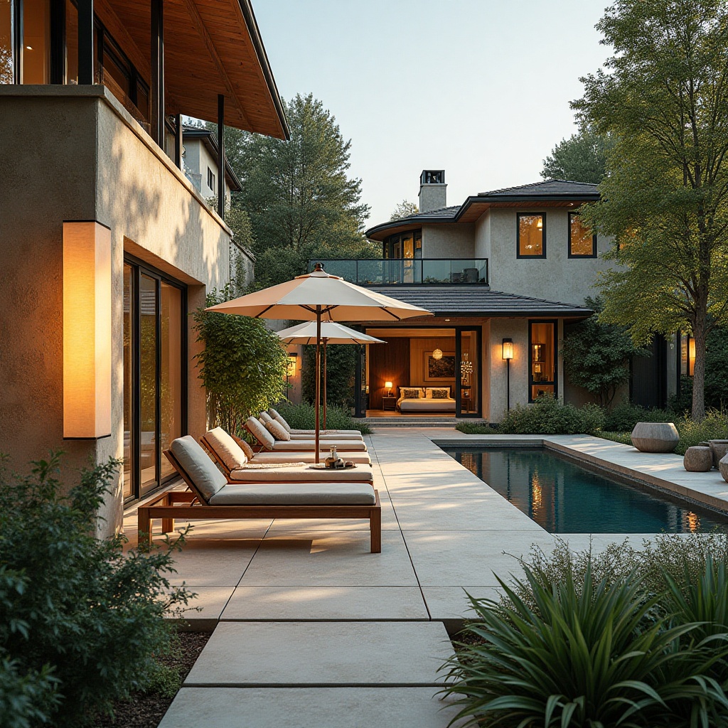 architecture, backyard, design, evening, greenery, home, landscaping, leisure, lounge chairs, luxury, nature, outdoor, patio, peaceful, relaxation, sunbathing, swimming pool, tranquility, umbrellas, warm light