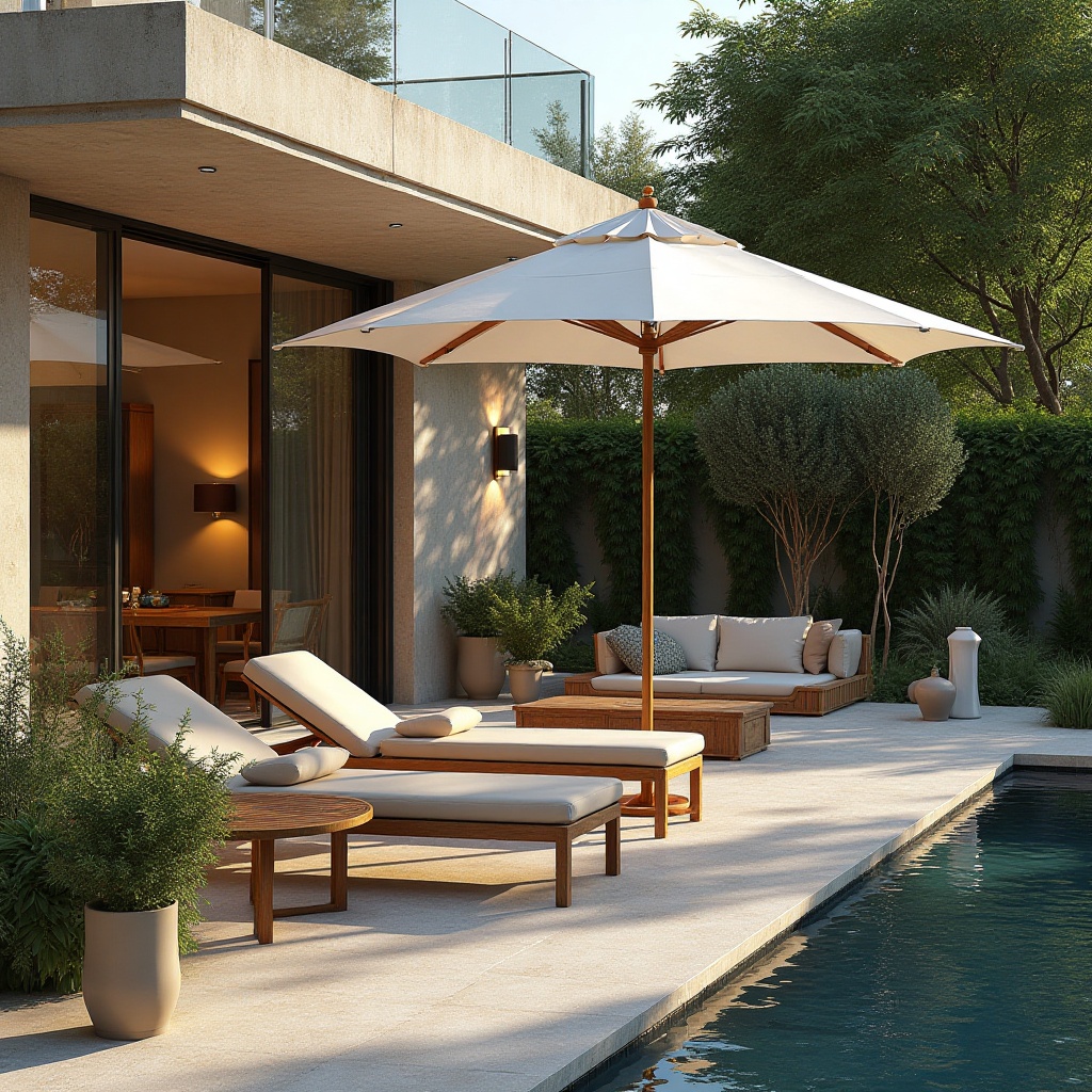 This elegant outdoor space features wooden loungers and an umbrella, perfect for enjoying sunny days by the pool in a modern setting.