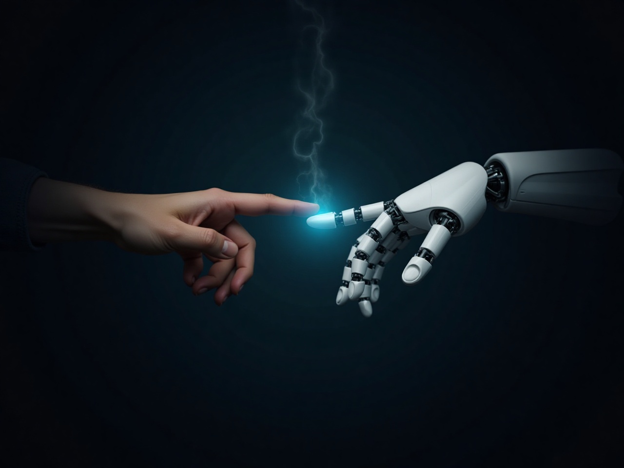 A human finger reaches toward a robotic hand, igniting a spark of light, symbolizing the union of humanity and technology.