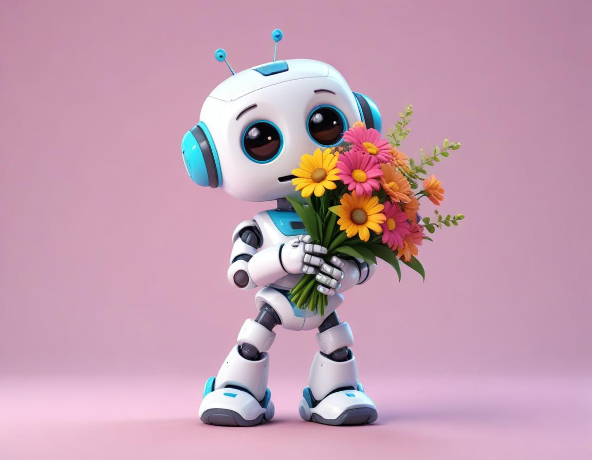 A small, friendly robot stands against a pink background, holding a vibrant bouquet of flowers, showcasing a charming and cheerful demeanor.