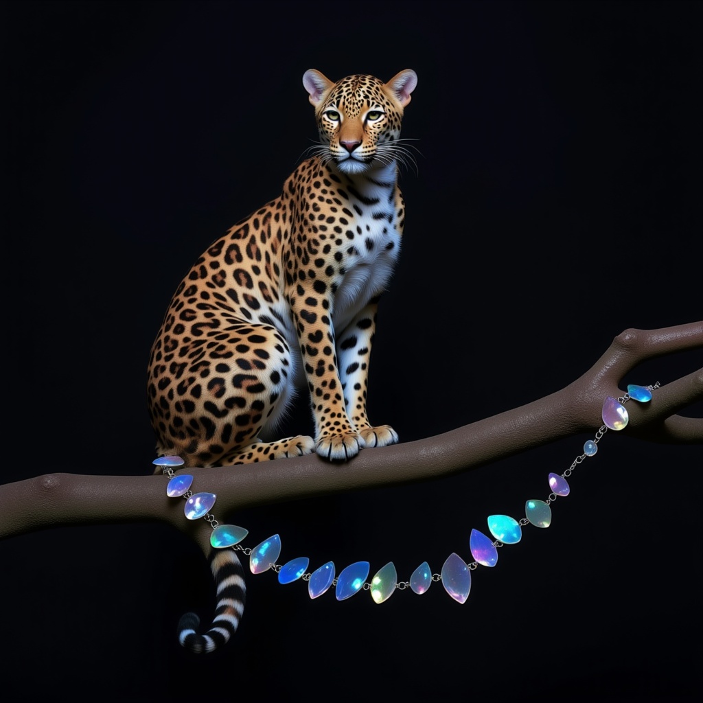 Leopard posing elegantly with a shimmering necklace