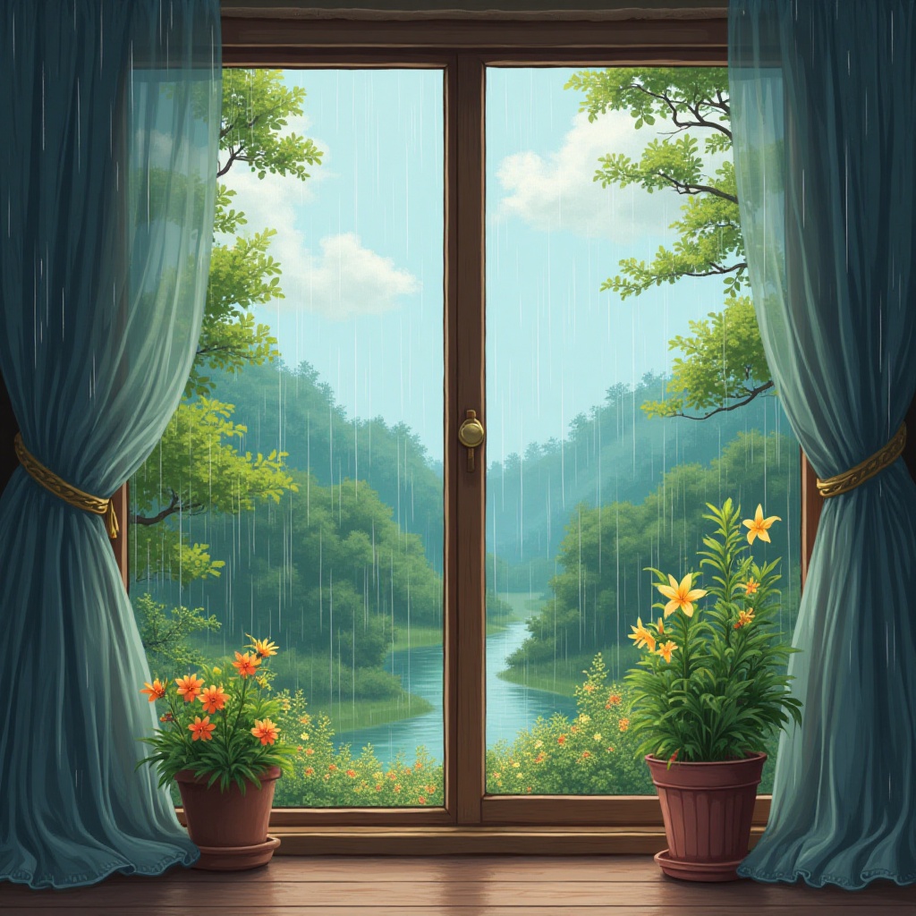Gentle rain falls outside a rustic window surrounded by flowers. Lush greenery and a serene river create a peaceful countryside atmosphere.