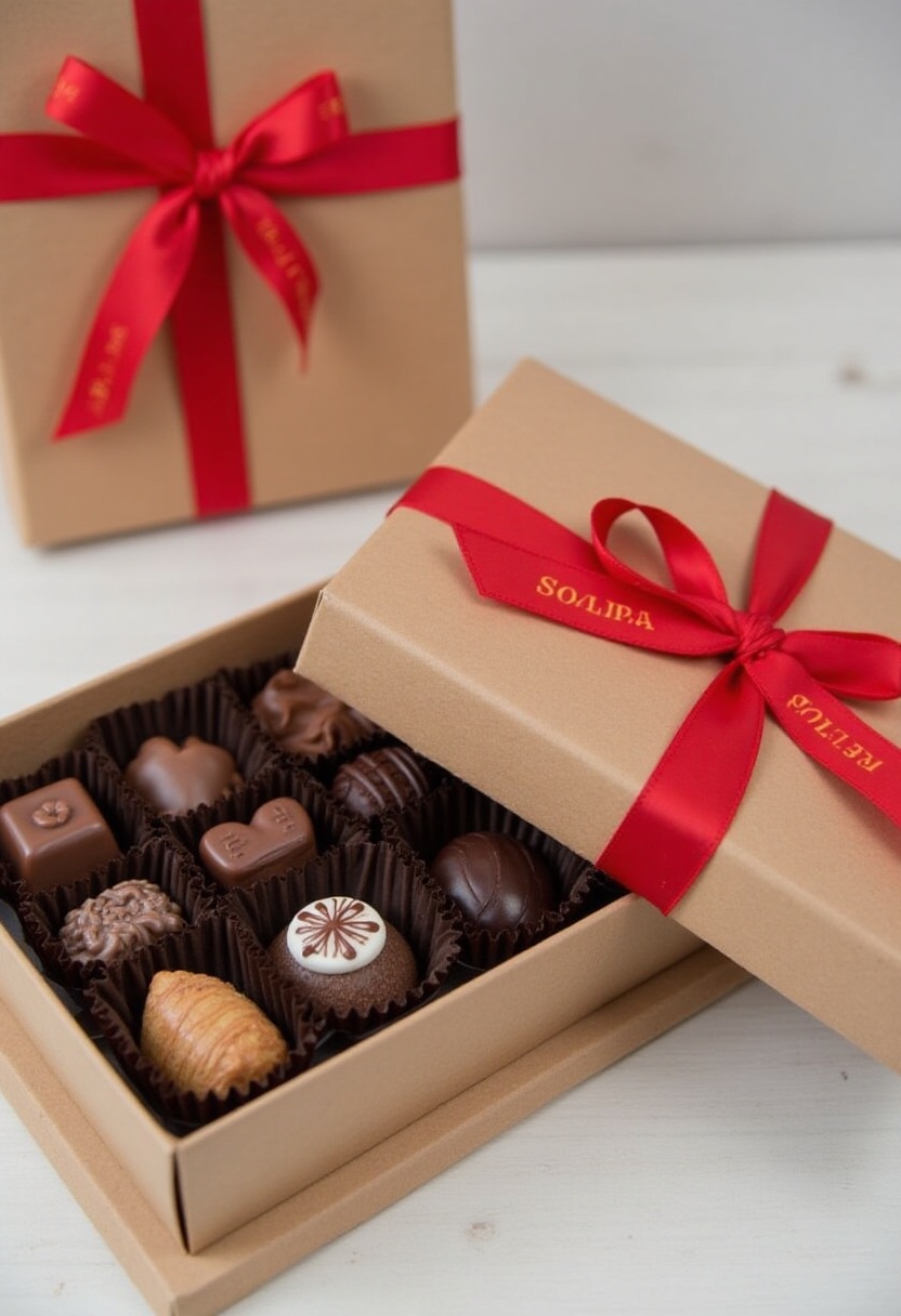 A gift box filled with assorted chocolates showcases elegant treats tied with a vibrant red ribbon, perfect for special occasions.
