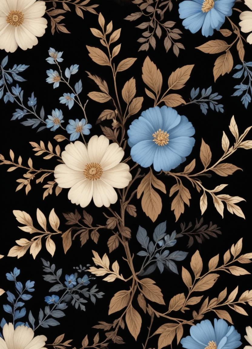 A vibrant floral pattern showcases blue and white blossoms intertwined with leaves against a deep black backdrop, creating an elegant contrast.