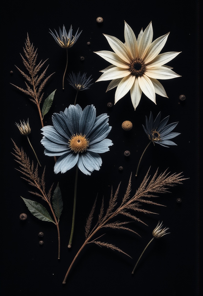 Delicate arrangement of dried flowers and foliage set against a dark background, showcasing unique textures and colors in an artistic display.
