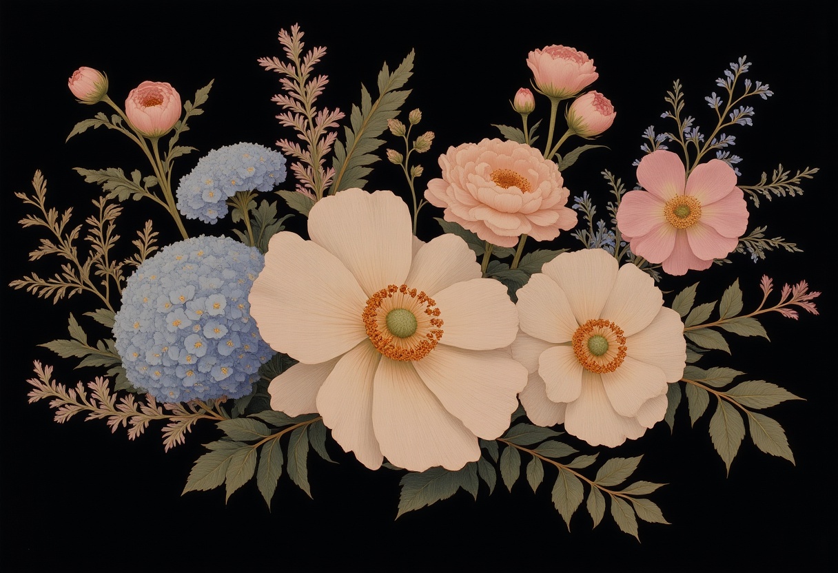 anemones, arrangement, art, blooms, blue flowers, botanical art, composition, dark background, decorative, designs, elegant, floral arrangement, flowers, garden, illustrations, leaves, nature, peonies, petals, plants