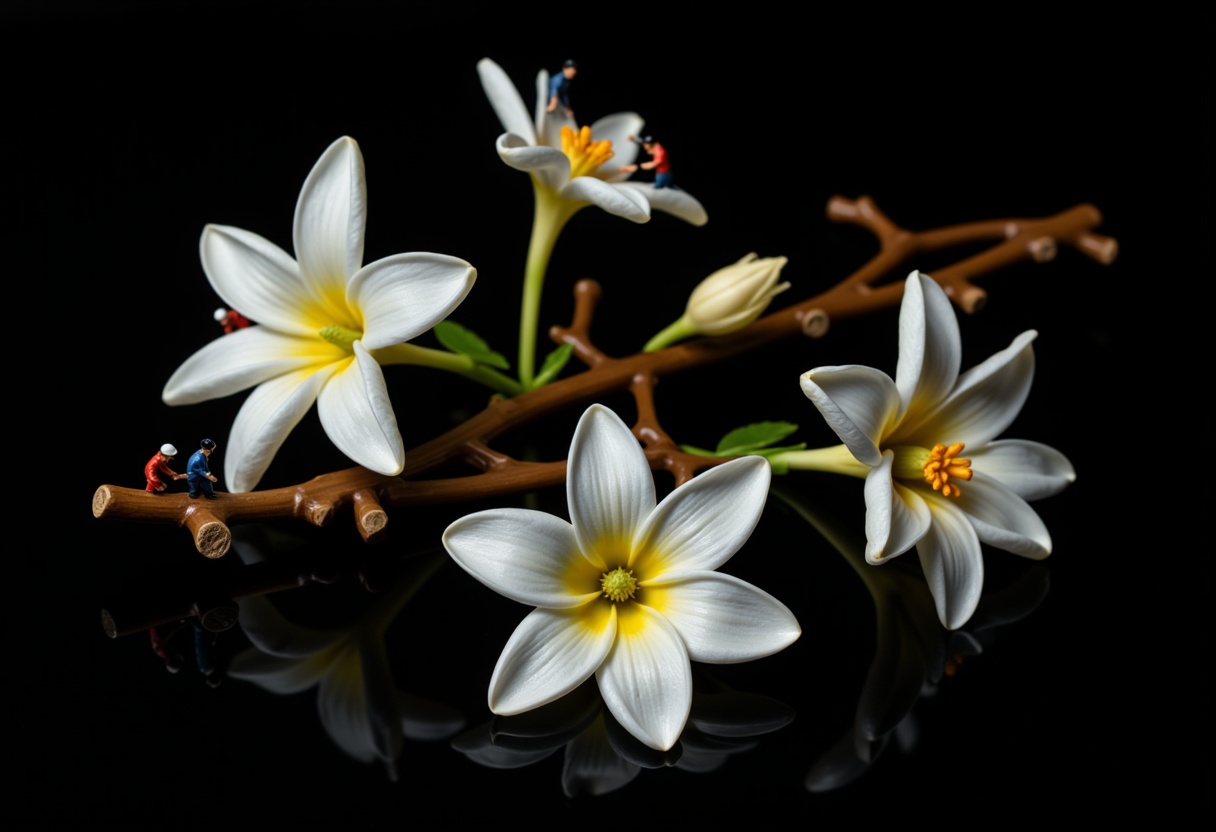 Tiny figurines interact with beautiful white flowers on a dark background, showcasing intricate details and artistic expression in a creative setup.