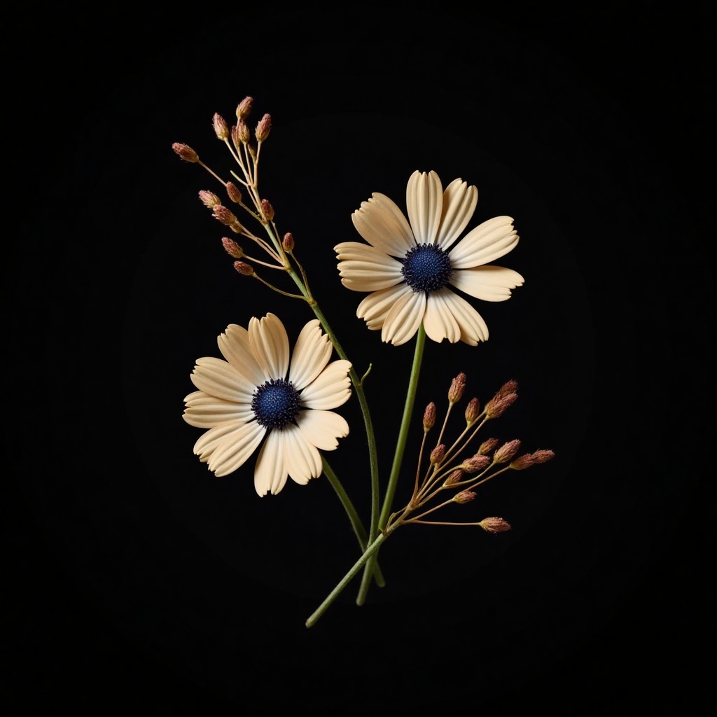 Three elegant flowers with pale petals and dark centers are arranged with budding stems, creating a striking visual contrast on a black backdrop.