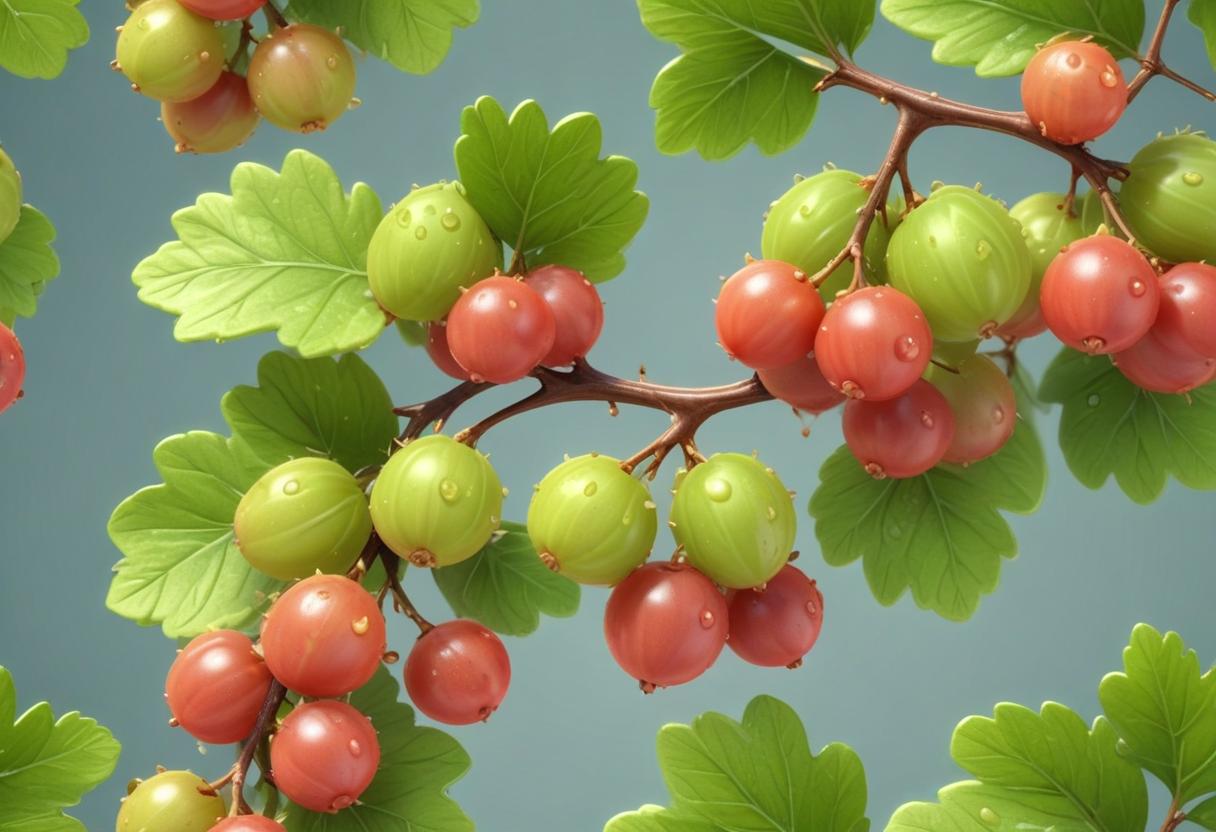 Bunches of ripe red and green berries hang from vibrant green leaves, showcasing the freshness of springtime in nature.