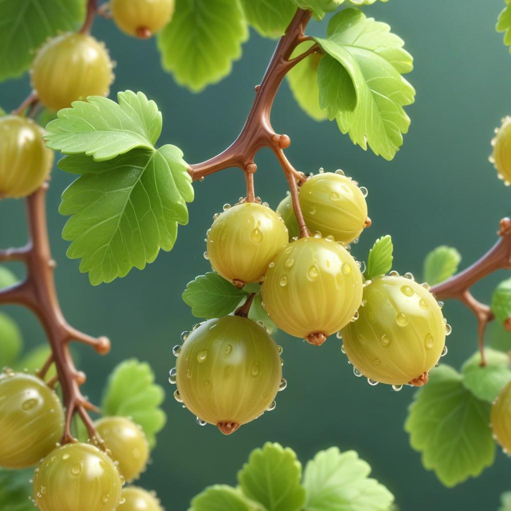 Bunches of ripe green currants hang from a vine, adorned with water droplets, showcasing their freshness in a lush green setting.