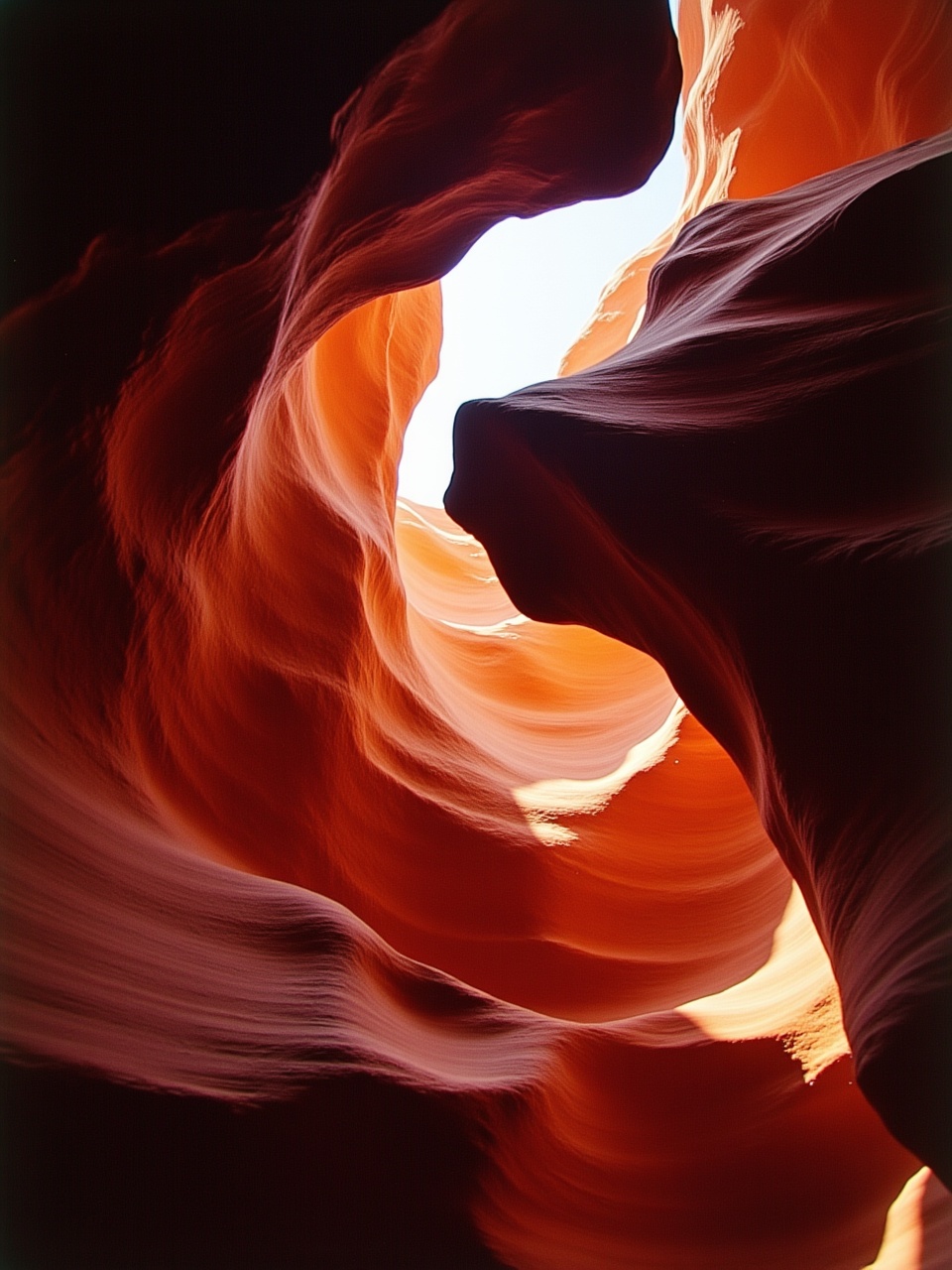 Winding red sandstone shapes create a stunning visual effect as sunlight filters through Antelope Canyon, showcasing nature's artistry in Arizona.