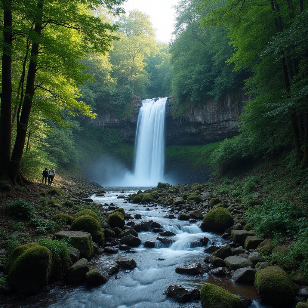 Two hikers enjoy the breathtaking view of a waterfall cascading into a serene river amidst vibrant green trees at dawn.