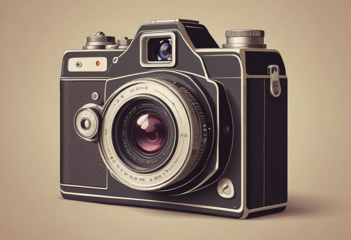A vintage camera showcases its design, featuring a prominent lens and retro aesthetics, perfect for photography enthusiasts and collectors.