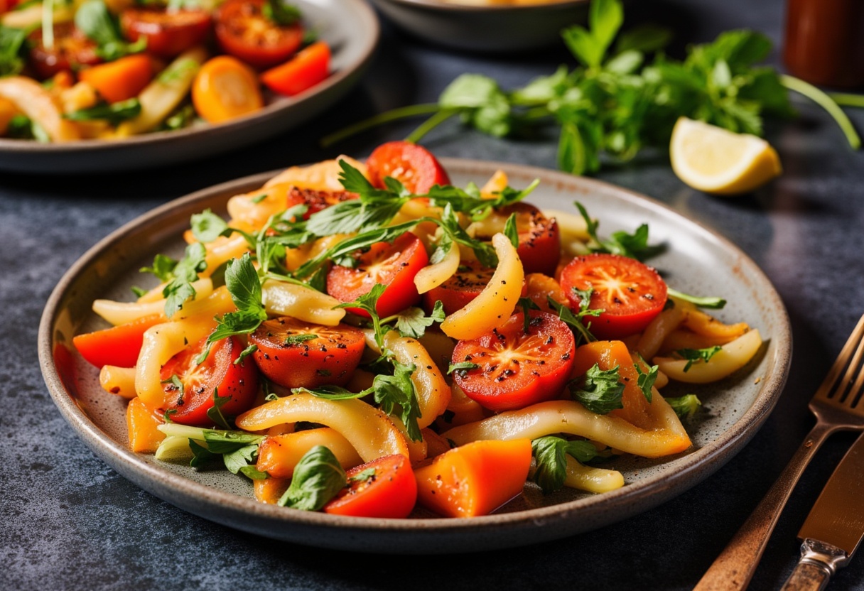 colorful, cooking, dinner, dish, flavor, fresh, gourmet, greens, healthy, herbs, ingredients, lunch, meal, onions, plate, presentation, salad, texture, tomatoes, vegetarian
