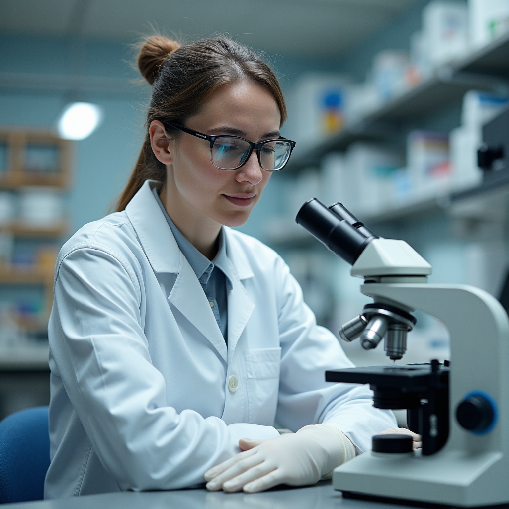 A researcher in a white lab coat examines microscopic samples using a microscope, surrounded by laboratory equipment on shelves.